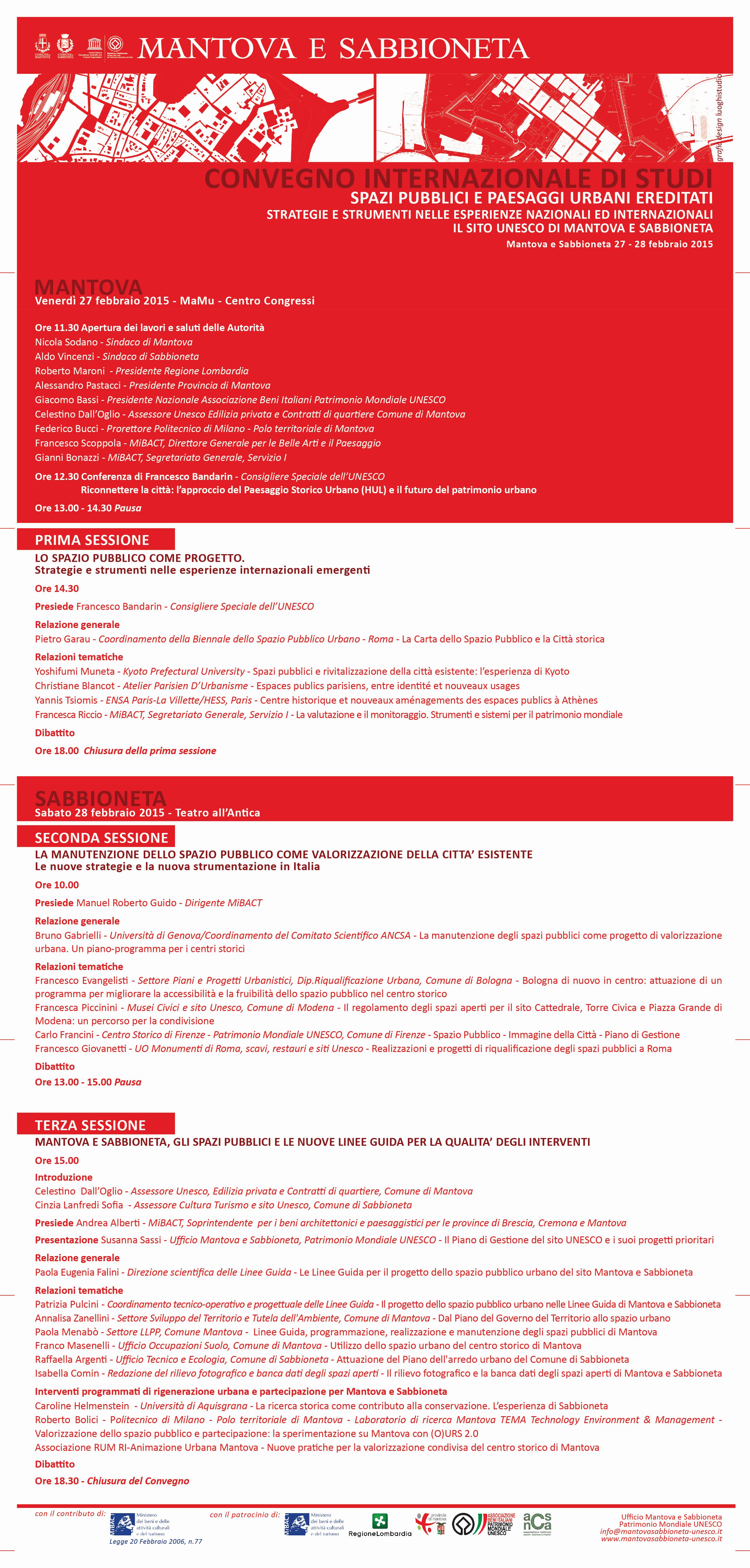 Il convegno "Spazi pubblici e paesaggi urbani ereditati. Strategie e strumenti nelle esperienze nazionali e internazionali. Il sito Unesco di Mantova e Sabbioneta" che si terrà venerdì 27 febbraio a Mantova nel Centro Congressi Mamu dalle 11,30 in poi e sabato 28 a Sabbioneta nel Teatro dell'Antica dalle 10 in poi vuole fare il punto sul dibattito nazionale e internazionale sul tema sempre più rilevante della gestione dello spazio pubblico delle città d'arte e in particolare dei siti Unesco, mettendo a confronto esperienze autorevoli e significative.