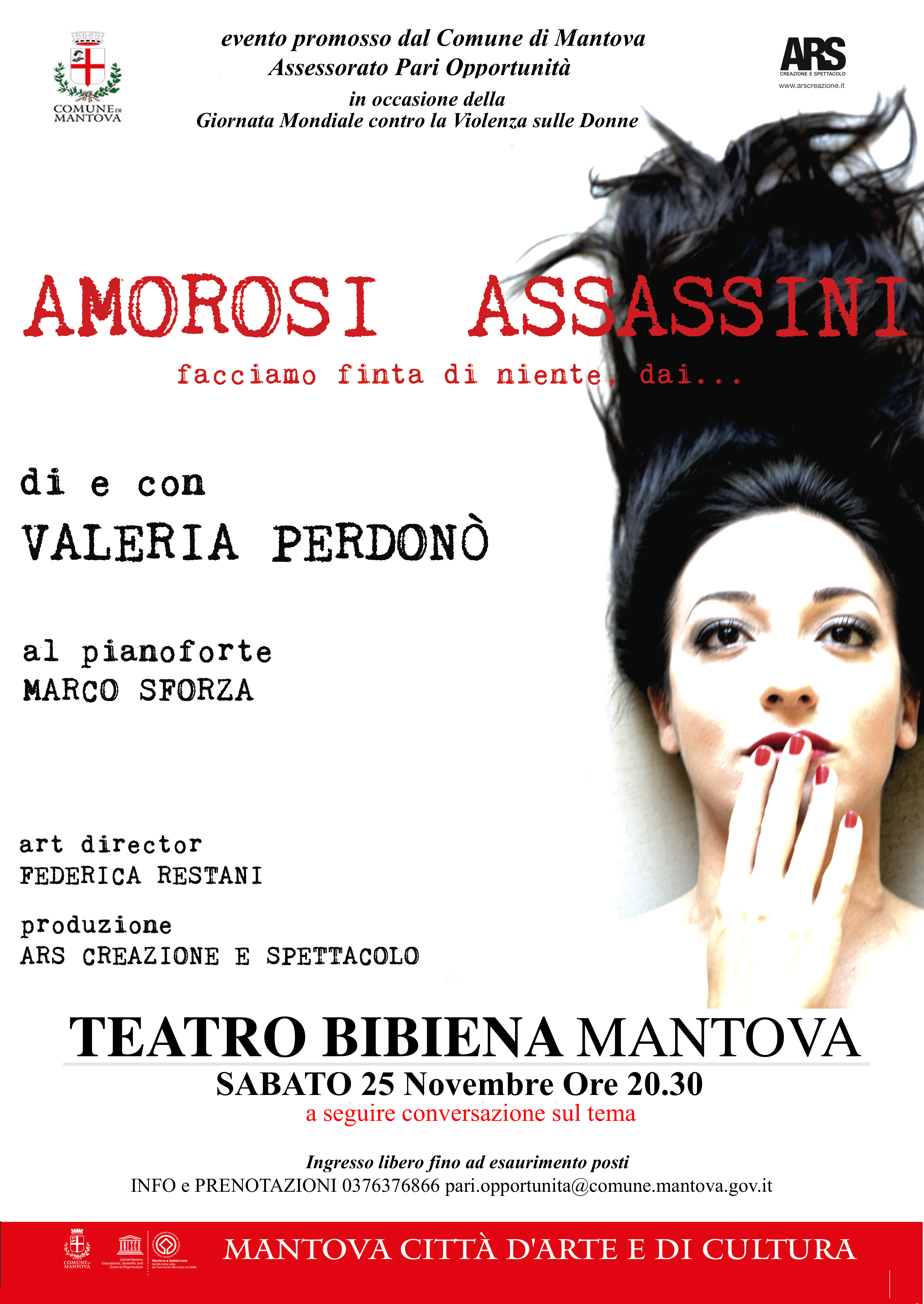 In occasione della Giornata Mondiale contro la Violenza sulle Donne il Settore Pari Opportunità del Comune di Mantova promuove per sabato 25 novembre alle ore 20.30 presso il Teatro Bibiena lo spettacolo AMOROSI ASSASSINI ...facciamo finta di niente, dai! di e con Valeria Perdonò, gli arrangiamenti musicali e musiche dal vivo di Marco Sforza, con la regia di Paola Tiziana Cruciani, art director Federica Restani, produzione Ars. Creazione e Spettacolo.