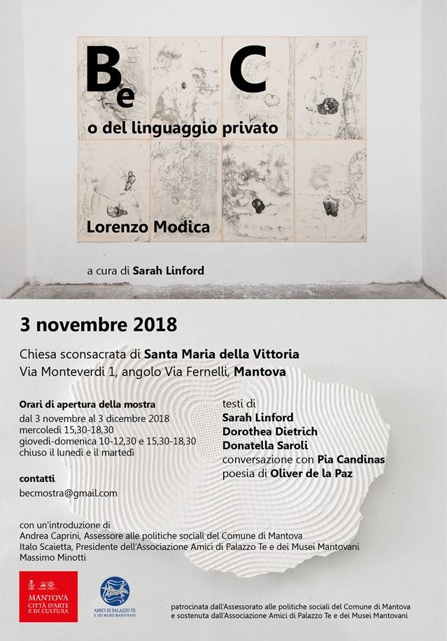 Mostra a cura di Sarah Linford dal 3 novembre al 3 dicembre 2018 a Santa Maria della Vittoria: attraverso un’ottantina di opere, tra cui monotipi mixed media, chine, installazioni e sculture site-specific, Modica da forma artistica al “linguaggio privato” di due gemelli diagnosticati autistici. Dal minimale e mutabile sistema di gesti e di parole con il quale i fratelli B. e C. restituiscono il mondo, l’artista ha intrapreso una ricerca profonda e di una straordinaria bellezza sulle condizioni di emergenze del senso — tra codice, convenzione, contesto e ambiguità. Con una particolare sensibilità alla polisemia dei materiali ed a tecniche intimamente singolari, l’artista interroga l’ambigua zona tra contenuto e significato, tra stato mentale e intenzione, tra corpo e atto, tra riconoscimento visivo e smarrimento del senso — e dei sensi.