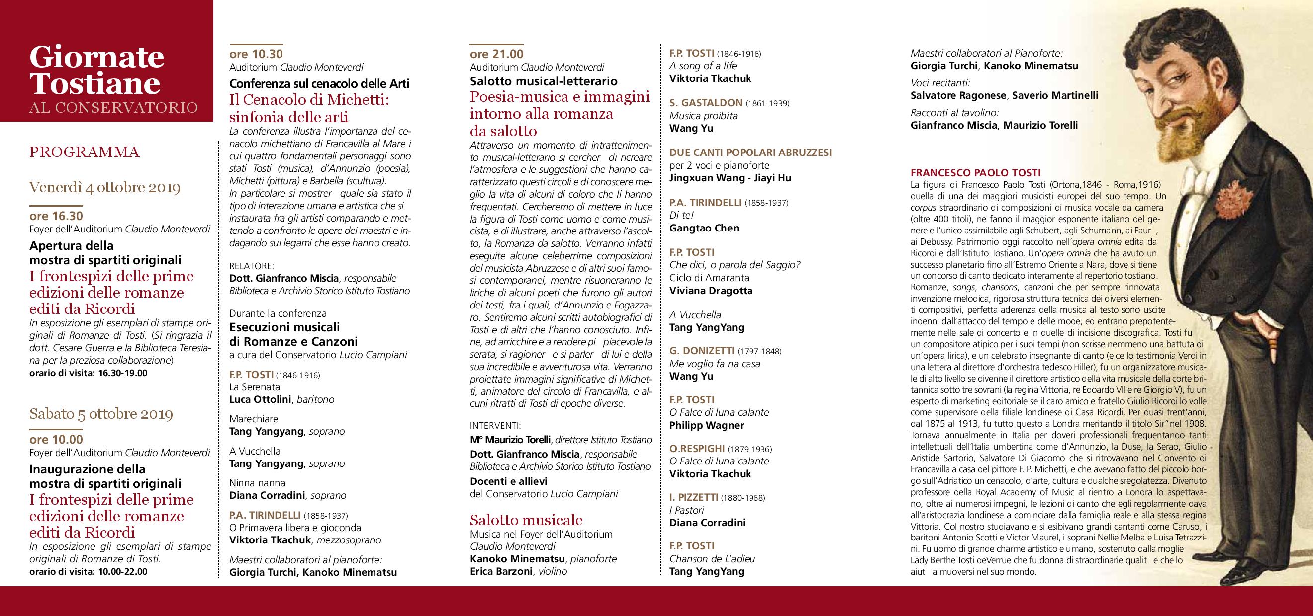 Sabato 5 ottobre alle ore 21 presso il Foyer e l’Auditorium Monteverdi del Conservatorio con l’evento del salotto letteral-musicale si concluderanno le giornate tostiane.
