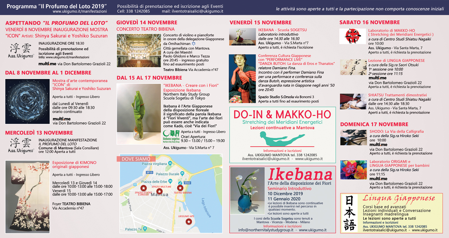 All’interno dell’evento verranno proposti workshop gratuiti di Lingua Giapponese, Shodo ( Arte della calligrafia), Shiatsu, Ikebana, Origami per bambini, Trattamenti dimostrativi di Shiatsu, Pratica di Do-In e Makko-HO, Lezioni introduttive allo Shiatsu, esposizione di Ikebana a cura del Northern Italy Study Group Scuola Sogetsu di Tokyo, mostra d’Arte Contemporanea di Artisti Giapponesi, conferenza e performance Danza Butoh. Le varie attività dell’Evento si svolgeranno in varie location di Mantova: Via Santa Marta, 7 ( sede di UKigumo Aps), spazio multi.me via Don Bartolomeo Grazioli 22, Teatro Bibiena Via Accademia 47.