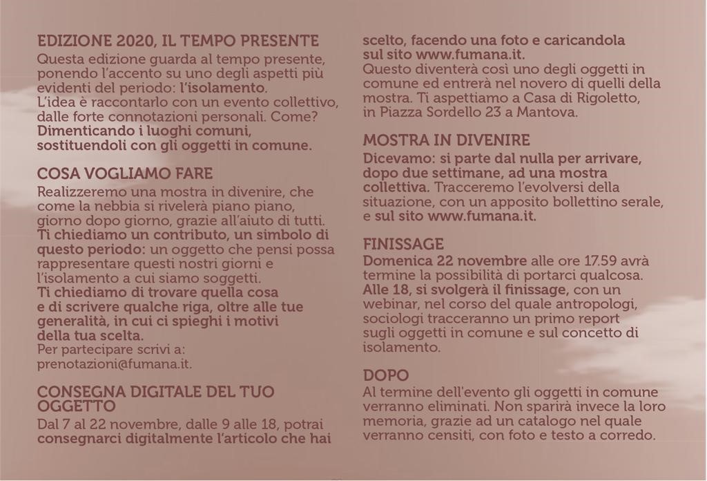 Ne nascerà una mostra collettiva “in divenire”, che come la nebbia si rivelerà piano piano, giorno dopo giorno, grazie al contributo di tutti. L'obiettivo è quello di fornire uno spaccato dell’isolamento individuale e della sua percezione nel contesto sociale, filosofico e geografico, nonché del mutato rapporto con gli oggetti e i beni personali.