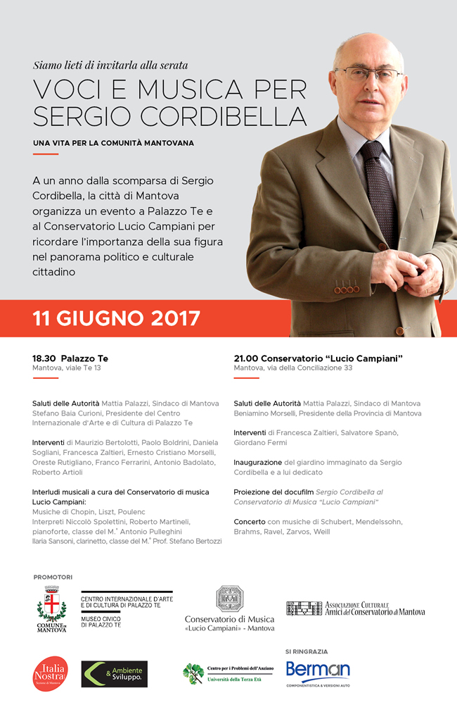 La città di Mantova commemora Sergio Cordibella, a un anno dalla sua scomparsa, domenica 11 giugno a Palazzo Te e al Conservatorio “Lucio Campiani” con un evento per ricordare l’importanza della sua figura nel panorama politico e culturale mantovano. “VOCI E MUSICA PER SERGIO CORDIBELLA – Una vita per la comunità mantovana” questo il nome dei due eventi che si terranno rispettivamente nella Sala dei Cavalli, a partire dalle ore 18.30 e al Conservatorio “Lucio Campiani”, a partire dalle ore 21.00. La serata è promossa dal Comune di Mantova in collaborazione con le istituzioni cittadine che hanno compreso profondamente le idee e la capacità progettuale di Sergio Cordibella, quali il Centro Internazionale d’Arte e di Cultura di Palazzo Te, il Conservatorio “Lucio Campiani”, l’Associazione Amici del Conservatorio, Italia Nostra, l’Associazione Ambiente e Sviluppo e il Centro per i Problemi dell’Anziano-Università della Terza Età di Mantova.